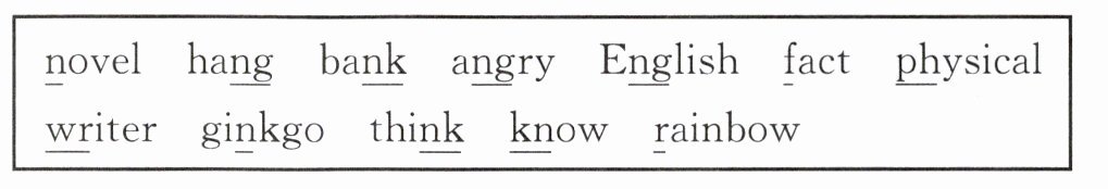 1. novel; know 2. hang; ginkgo 3. bank; think 4. angry; English 5. fact; physical 6. writer; rainbow