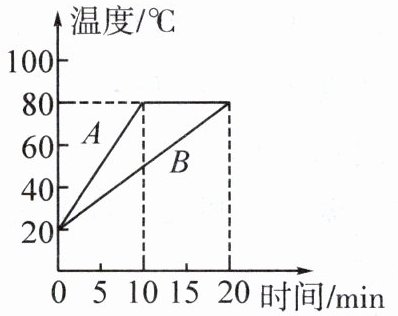 5. [2024·阆中期中]用相同的电加热器分别对质量相等的 $A$ 和 $B$ 两种液体加热(不计热量损失),如图是 $A$ 和 $B$ 的温度随加热时间变化的图像,加热相同时间 $A$ 和 $B$ 吸收的热量之比为______,$A$ 和 $B$ 的比热容之比为______。