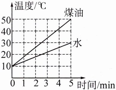 6. [2023·连江县月考]用相同的电加热器分别给相同质量的水和煤油加热,经过 $5\min$,水吸收的热量为 $4.2×10^{4}J$,温度变化如图所示[水的比热容 $c_{水}=4.2×10^{3}J/(kg\cdot^{\circ}C)$,且大于煤油的比热容]。求: