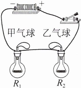 10. [2020·成都]小彬用如图所示的实验装置探究电流的热效应跟电阻大小的关系,电源电压为 3 V,电阻丝 $ R_1 = 10 \Omega $,$ R_2 = 20 \Omega $,两气球相同。闭合开关后,密闭烧瓶内的空气被加热,他观察到________气球先鼓起来。通电 1 min,$ R_2 $ 产生的热量为________J。