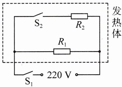 7. 如图所示,这是有高温和低温两挡的暖手宝的工作电路图,电源电压 $ U = 220 V $,发热体由 $ R_1 $ 和 $ R_2 $ 两个电热丝(阻值均不变)构成,只闭合 $ S_1 $ 时为低温挡,功率是 110 W;开关 $ S_1 $、$ S_2 $ 都闭合时为高温挡,通过电热丝 $ R_2 $ 的电流为 2 A。求: