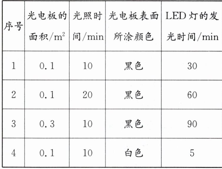 5. 光伏发电的核心部件是光电板,光电板吸收太阳能的多少是技术关键,它与什么因素有关?小明猜想光电板吸收太阳能的多少可能与光电板的面积、光照时间、光电板的颜色有关。根据以上猜想,小明设计实验方案,进行了实验探究,实验数据记录如表。
