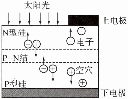 光伏发电是利用半导体界面的“光生伏特效应”而将光能直接转变为电能的一种技术。“光生伏特效应”简称“光伏效应”,是指光照使不均匀半导体或半导体与金属结合的不同部位之间产生电位差(电压)的现象。如图所示,太阳能电池内部的 P 型硅和 N 型硅结合在一起,它们的交界面附近的区域形成 PN 结。当适当频率的光照射 PN 结时,由于内建电场的作用,受激电子和空穴各自向相反的方向运动,电子收集到上电极,空穴收集到下电极,产生电动势,称为光生电压。这种由 PN 结的内建电场引起的光电效应,称为光生伏特效应。