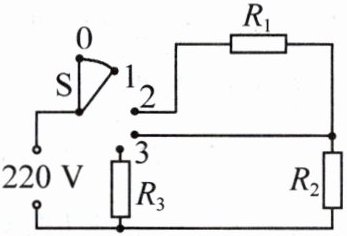 7. [2023·攀枝花]某品牌电煎锅的简化电路如图所示,它分为高、中、低三挡,最大功率为$990W$。$S$为旋钮开关,转动$S$可将开关分别调至$0$、$1$、$2$、$3$挡位置,与该挡的两个触点同时接通。$R_{1}$、$R_{2}$、$R_{3}$为发热电阻,且阻值恒定。将电煎锅接入$220V$的家庭电路中,当开关$S$旋至$1$挡时,电路的工作电流为$1A$;当开关$S$旋至$2$挡时,电路的功率为$550W$。某次用$2$挡烹饪中,用时$1min$将质量为$50g$、比热容为$4.0×10^{3}J/(kg·^{\circ}C)$的某种食物从$20^{\circ}C$加热至$119^{\circ}C$。求: