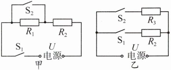 (1)高$ \frac{U^{2}}{R_{2}} S_{1} $闭合,$S_{2} $断开$ (\frac{U}{R_{1}+R_{2}})^{2}R_{2} (2)$高$ \frac{U^{2}}{R_{2}}+\frac{U^{2}}{R_{3}} $低$ \frac{U^{2}}{R_{2}}$或$\frac{U^{2}}{R_{3}} (3)$乙 在甲电路中,低温挡时$R_{1}$要发热,浪费电能