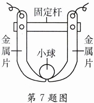 7. 如图所示是电扇中的一个自动保护装置,当电扇不慎被碰倒或倾倒时,小球就会滚向一侧使电路______(填“断开”“短路”或“闭合”),起到保护电扇的作用,这个保护装置在电扇电路中的作用相当于______。