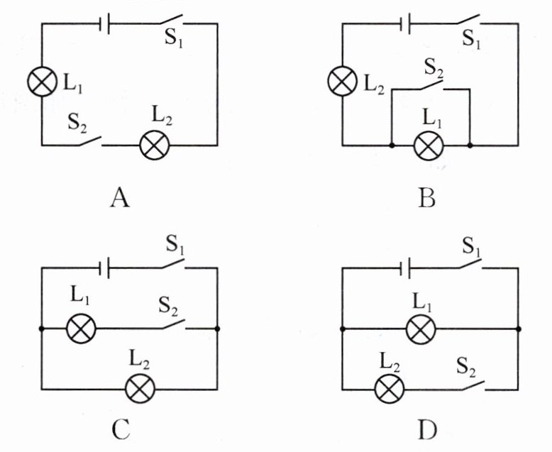 (1)为了提高行车的安全性,汽车装有日间行车灯,如图甲所示。当汽车启动时,$ S_1 $ 闭合,日间行车灯 $ L_1 $ 立即亮起,再闭合 $ S_2 $,车前大灯 $ L_2 $ 也亮起。下列电路图中符合这一情况的是____。