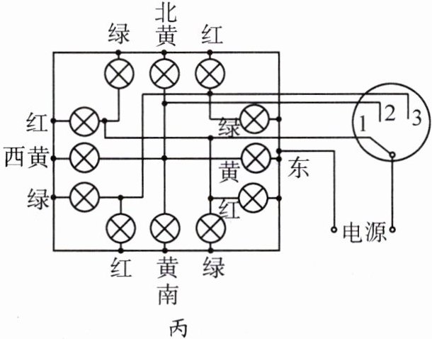 (3)按照我国交通管理的规定,“红灯停、绿灯行、黄灯预备。”小明在科技活动中设计了一个实验电路,如图丙所示。用以模拟十字路口的红绿灯控制。请你认真分析: