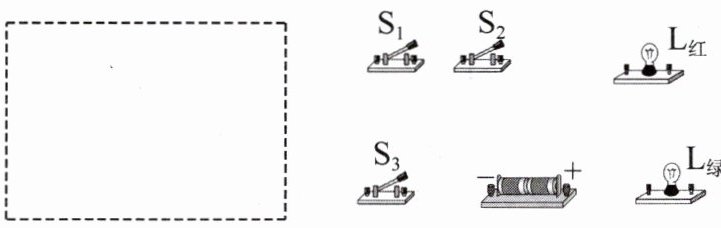 6. 某保密室有三道门,关上一道门相当于闭合一个开关。只要有一道门没有关上,红色和绿色的指示灯都会发光。当三道门都关上时,红灯会熄灭,只有绿灯会发光。请设计出符合要求的电路图画在虚线的方框内,并根据所设计的电路图用笔画线将实物连接成符合要求的电路。(要求:连线不能交叉,线头接在接线柱上)