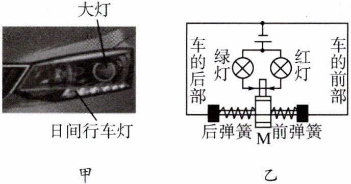 (2)汽车中有如图乙所示的电路,其中上端带金属细杆的金属滑块 $ M $ 与两侧金属弹簧相连接并接入电路中,金属滑块 $ M $ 与弹簧套在光滑绝缘的水平细杆上。当汽车静止时,滑块 $ M $ 上的金属细杆与红、绿灯一端的触头(图中箭头)都不接触。当汽车向前启动时,____灯亮。