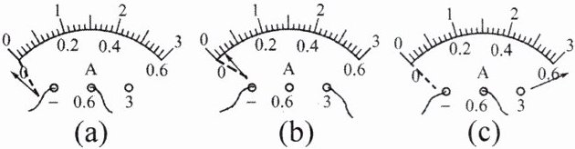 11. 甲、乙、丙三位同学在做用电流表测电流的实验中,闭合开关前,他们的电流表指针在零刻度处,当闭合开关试触时,发现电流表指针摆动分别出现了如图(a)、(b)、(c)所示的三种情况。而小虎和小明在做同样的实验时,小虎刚接好最后一根导线,灯即发光;小明正确连接好电路,刚要闭合开关时,发现电流表指针如图(b)所示。请分析他们在实验时分别存在什么问题,并写在下面的横线上。