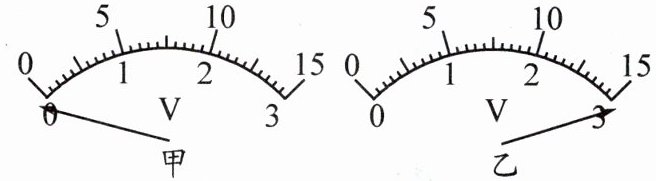 4. 某同学在用电压表测电压前,已将指针调到“0”刻度线上,第一次将电压表接入电路时,指针偏转情况如图甲,这是因为____________________;纠正后,第二次把电压表接入电路时,指针偏转情况如图乙,这是因为____________________,应该____________________。
