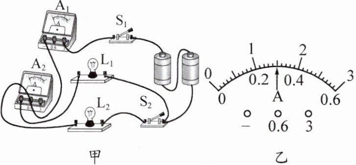 10. [2024·东坡区期中]如图甲所示的电路,闭合开关 $ S_1 $、$ S_2 $ 时,灯泡 $ L_1 $ 和 $ L_2 $ 发光。电流表 $ A_1 $、$ A_2 $ 的指针指在同一位置如图乙所示。下列说法正确的是( )