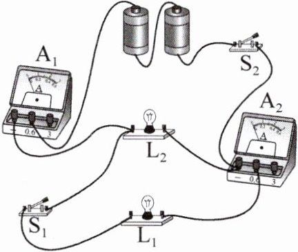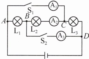 (1)当开关 $ S_1 $、$ S_2 $ 都闭合时,若 $ A_1 $、$ A_2 $、$ A_3 $ 读数依次为 $ 0.5 A $、$ 0.2 A $、$ 0.6 A $,则通过灯 $ L_1 $、$ L_2 $ 和 $ L_3 $ 的电流 $ I_1 $、$ I_2 $、$ I_3 $ 分别为____ $ A $、____ $ A $、____ $ A $。