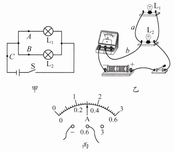 (2)小覃同学要测量通过 $ L_2 $ 的电流,只需将图乙中导线____(填“$ a $”或“$ b $”)的一端移动到电流表的负接线柱上;重新连接好电路后,闭合开关,电流表的示数如图丙所示,则电流表的示数为____ $ A $。