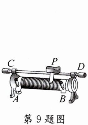 9. [2024·自贡]如图所示是滑动变阻器的结构示意图,当滑片 P 向右移动时,要使连入电路中的电阻变大,应选择的接线柱为( )