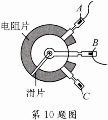 10. [2023·天津]电位器实质是一种变阻器,如图所示是电位器的结构和连入电路的示意图,A、B、C 是接线柱。当滑片向 A 端旋转时,连入电路的电阻( )