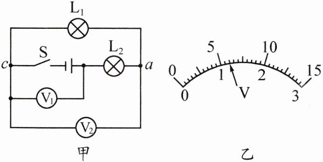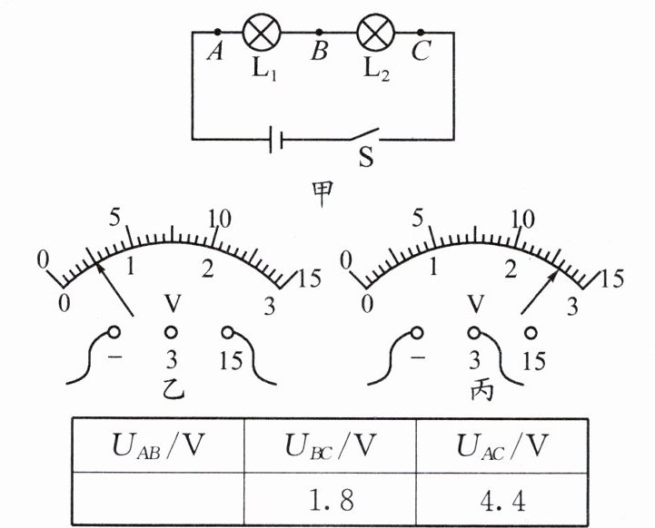 $(3)$调整后,再次闭合开关,电压表的示数如图丙所示,此时$ AB $两点间的电压为_________V。接着,再分别测出$ BC、$$AC $间的电压并记录在表格中,分析实验数据得出结论:串联电路中,_________(写出$ U_{AB}、$$U_{BC}$和$ U_{AC}$之间的关系式即可$)。$