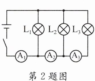 2. [2023·迎泽区一模]如图所示,通过灯 L₁的电流为 0.3 A,通过灯 L₂的电流为 0.2 A,通过灯 L₃的电流为 0.1 A,现在用 I₁、I₂、I₃分别表示 A₁、A₂、A₃的读数,则下列说法正确的是( )