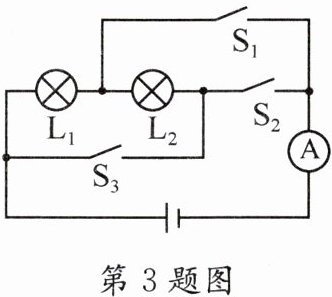3. 在如图所示的电路中,L₁和 L₂是两个不同规格的灯泡。若只闭合开关 S₂时,电流表的示数为 0.2 A,则通过灯 L₁的电流是______A;当只闭合开关 S₁和 S₃时,灯 L₁和 L₂是______联,电流表测量的是通过______(填“灯 L₁”“灯 L₂”或“干路”)的电流。