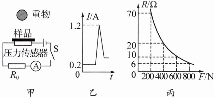 12. 某工厂要研发一种新型材料,要求对该材料承受的撞击力进行测试。如图甲所示,在测试时将材料样品(不计质量)平放在压力传感器上,闭合开关 $S$,由静止自由释放重物,经撞击后样品材料仍完好无损。从重物开始下落到撞击样品的过程中,电流表的示数 $I$ 随时间 $t$ 变化的图像如图乙所示,压力传感器的电阻 $R$ 随压力 $F$ 变化的图像如图丙所示。电源电压为 $24\ V$,定值电阻 $R_{0}=10\ \Omega$。求: