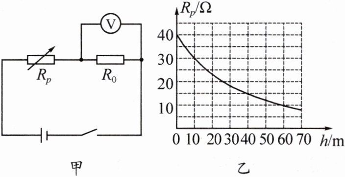 9. [2023·雅安]随着我国经济的发展,人民生活水平日益提高,我国出现了越来越多的潜水爱好者。为了保障安全,潜水员潜水时会佩戴水压表和深度表。图甲是某深度表的工作原理简化电路图,电源电压 $U = 6\ V$ 且恒定不变,定值电阻 $R_{0}=15\ \Omega$,$R_{p}$ 是阻值随水深度变化的电阻,其变化关系图像如图乙所示。求: