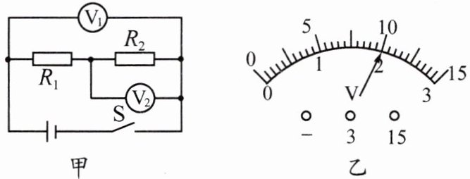 10. 在如图甲所示的电路中,当闭合开关 $S$ 后,两个电压表指针偏转均如图乙所示,则下列说法正确的是 ( )