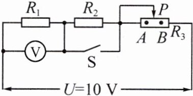 7. 在如图所示的电路中,已知$R_{2}=2R_{1}$,电源电压$U = 10V$且保持不变。闭合开关$S$,并调节滑片$P$使它位于$R_{3}$的$A$处,这时流过$R_{3}$的电流为$I_{A}$;后断开开关$S$,并调节滑片$P$,使它位于$R_{3}$的$B$处,这时流过$R_{3}$的电流为$I_{B}$,电压表示数为$3V$,若两次电流$I_{A}:I_{B}=2:1$。求: