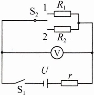 4. [2021·安徽]在如图所示的电路中,电源电压$U$不变,$r$、$R_{1}$和$R_{2}$均为定值电阻,其中$r = 1\Omega$,$R_{1}=14\Omega$,$S_{1}$为单刀单掷开关,$S_{2}$为单刀双掷开关。闭合$S_{1}$,将$S_{2}$掷于$1$端,电压表$V$的示数$U_{1}=2.8V$;将$S_{2}$切换到$2$端,电压表$V$的示数$U_{2}=2.7V$。求: