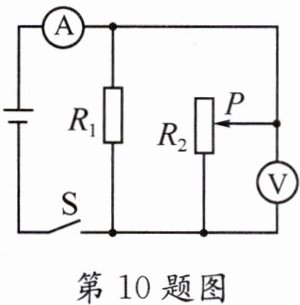 10. [2024·中江县期中]如图所示的电路中,电源电压不变,当闭合开关 $ S $,滑动变阻器的滑片 $ P $ 从中点向上移动时,$ R_2 $ 接入电路中的阻值______;电流表的示数将______;电压表的示数将______。(均填“增大”“减小”或“不变”)