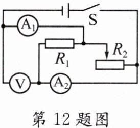 12. [2023·丹东二模]在如图所示的电路中,电源电压保持不变。闭合开关 $ S $,当滑动变阻器的滑片 $ P $ 向左移动时,电压表 $ V $ 的示数与电流表 $ A_1 $ 的示数之比______,电流表 $ A_1 $ 的示数与电流表 $ A_2 $ 的示数的差______。(均填“变大”“变小”或“不变”)