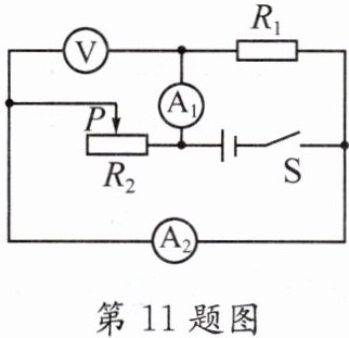 11. 在如图所示的电路中,闭合开关 $ S $,当滑动变阻器 $ R_2 $ 的滑片 $ P $ 向左移动时,电流表 $ A_1 $ 的示数将______,电压表 $ V $ 的示数与电流表 $ A_2 $ 的示数之比将______。(均填“变大”“变小”或“不变”)