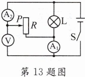 13. [2023·高新区期中]如图所示电路闭合开关,灯泡 $ L $ 正常发光。在滑片 $ P $ 向上移动的过程中,灯泡 $ L $ 的亮度______(填“变亮”“变暗”或“不变”),电流表 $ A_2 $ 的示数______(填“变大”“变小”或“不变”)。