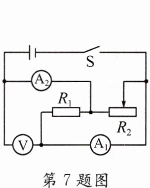 7. [2022·鄂州]如图所示,电源电压不变,闭合开关 $ S $,当滑动变阻器 $ R_2 $ 的滑片由最右端向中点滑动过程中,下列说法正确的是 ( )
