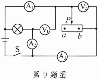 9. 在如图所示的电路中,电源电压恒定不变。闭合开关 $ S $,将滑动变阻器的滑片 $ P $ 由 $ a $ 点移动到 $ b $ 点的过程中,下列说法正确的是 ( )