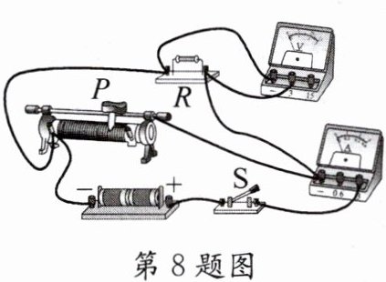 8. 在如图所示的电路中,电源电压保持不变,闭合开关 $ S $,将滑动变阻器的滑片 $ P $ 缓慢向右移动的过程中 ( )
