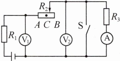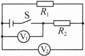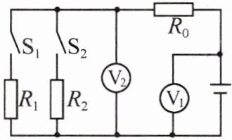 13. 在如图所示的电路中,电源电压保持不变。当只闭合开关$S_{1}$时,$R_{1}$两端的电压为$U_{1}$,电压表$V_{1}$与$V_{2}$的示数之比为$3:2$;当只闭合开关$S_{2}$时,$R_{2}$两端的电压为$U_{2}$,电压表$V_{1}$与$V_{2}$的示数之比为$4:3$。则$R_{1}$与$R_{2}$的阻值之比为____,电压$U_{1}$与$U_{2}$之比为____。