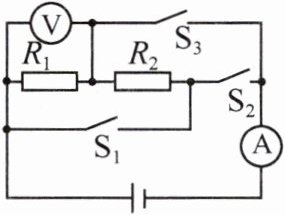 12. 如图所示,电源电压不变,当开关$S_{2}$断开,$S_{1}$、$S_{3}$闭合时,电流表的示数为$I_{1}$,电压表的示数为$U_{1}$;当开关$S_{2}$闭合,$S_{1}$、$S_{3}$断开时,电流表的示数为$I_{2}$,电压表的示数为$U_{2}$。已知$R_{1}:R_{2}=2:1$,则$I_{1}:I_{2}=$____,$U_{1}:U_{2}=$____。