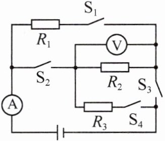 8. (多选)[2024·西城区期中]在如图所示的电路中,电源电压保持不变。只闭合开关$S_{1}$和$S_{3}$时,电流表的示数为$I_{1}$;只闭合开关$S_{1}$、$S_{4}$时,电流表的示数为$I_{2}$,电压表的示数为$3\ V$。已知$R_{1}:R_{2}=3:4$,$I_{1}:I_{2}=8:3$,则( )