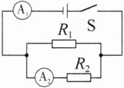 10. 如图所示,闭合开关$S$,两电流表$A_{1}$与$A_{2}$的示数之比为$5:3$,则电阻$R_{1}$与$R_{2}$两端的电压之比$U_{1}:U_{2}=$____,阻值之比$R_{1}:R_{2}=$____。