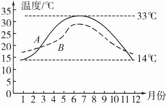 7. 如图所示是某一沿海城市和某一内陆城市年气温变化曲线。根据水的比热容比砂石的比热容______的特点,曲线$B$表示的是______(填“沿海”或“内陆”)城市的年气温变化曲线。