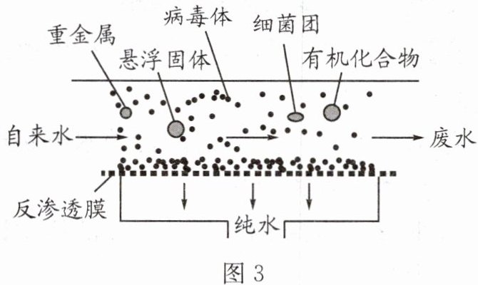 ②反渗透膜是净水机的核心技术,反渗透膜上的孔径只有0.0001~0.001μm,相当于一根头发丝的百万分之一,它的工作原理如图3所示,反渗透膜______(填“能”或“不能”)除去所有可溶性杂质,净化后的水属于______(填“纯净物”或“混合物”)。