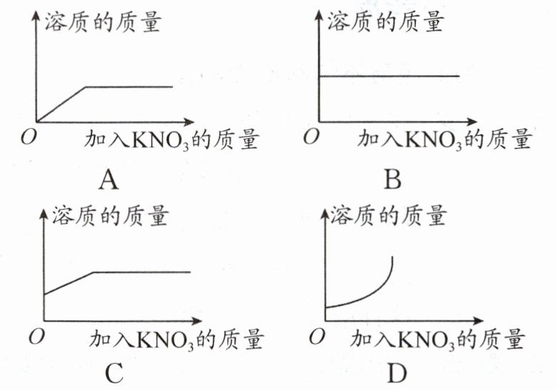 4. $25^{\circ}C$时,向一定量不饱和$KNO_3$溶液中逐渐加入$KNO_3$固体,下列图像能正确表示此过程中溶质质量变化规律的是( )