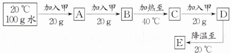 2. 已知:20℃时,甲物质在 100 g 水中最多溶解 30 g 就达到饱和;40℃时,在 100 g 水中最多溶解 50 g 就达到饱和。20℃时,进行了如图所示实验。