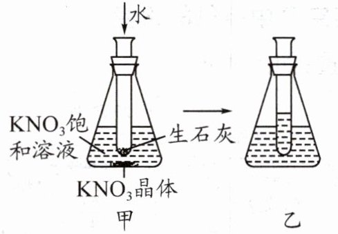 1. [2024·乐山改编]某同学设计如图甲所示实验,研究 KNO₃ 在一定量水中的最大溶解量随温度的变化。当向试管中加入一定量的水后,锥形瓶中的 KNO₃ 发生如图乙所示的变化。下列说法正确的是(已知生石灰与水反应放热)( )