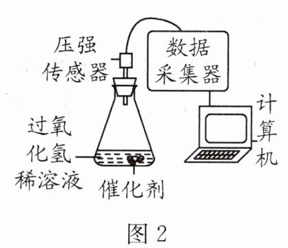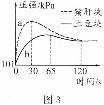 (4) 兴趣小组用图 2 所示装置探究不同催化剂对过氧化氢分解的催化效果。取大小相同的新鲜土豆块和新鲜猪肝块作催化剂,分别加入 10mL 相同浓度的过氧化氢稀溶液后,用传感器测量装置中压强的变化,如图 3 中曲线 a、b 所示。