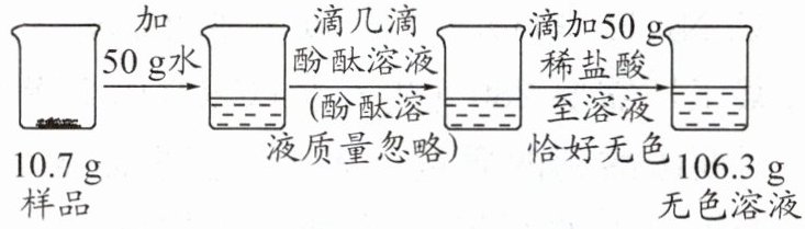 6. [2024·绥化节选]某毕业班同学去制纯碱的化工厂实习时,对该厂生产的纯碱产生了兴趣,于是取$10.7g$纯碱样品(含有少量的氯化钠)进行如下探究,完成以下问题。(已知:碳酸钠俗称纯碱,$Na_{2}CO_{3}+2HCl=2NaCl+H_{2}O+CO_{2}\uparrow$,酚酞在碳酸钠溶液中显红色)