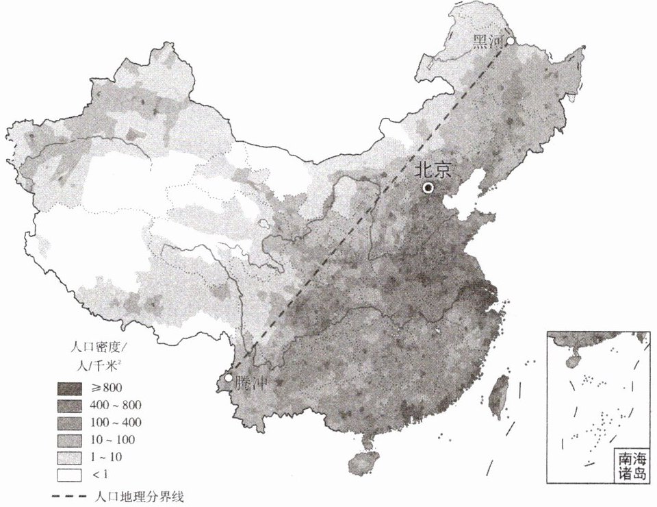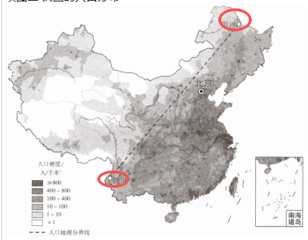 黑河—腾冲一线东南部人口密度较大,人口分布比较稠密;黑河—腾冲一线西北部人口密度较小,人口分布比较稀疏。 2.> <