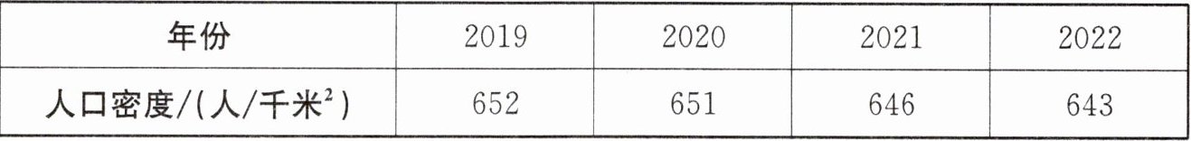 人口密度是指平均每平方千米内居住的人口数。2020年,我国平均人口密度为147人/千米²。下表示意我国某省2019年至2022年人口密度。据此完成下列问题。