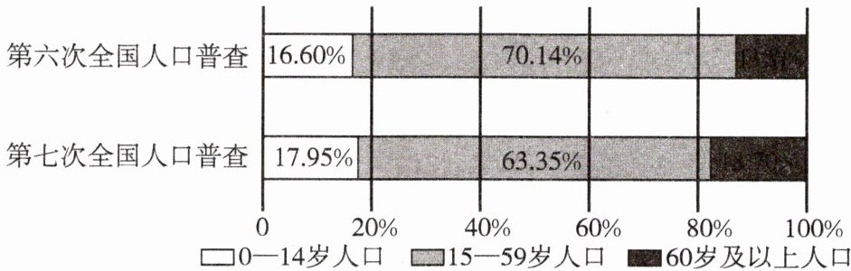 人口年龄结构是指少儿(0—14岁)人口、劳动力(15—59岁)人口和老年(60岁及以上)人口的比重情况。下图示意第六次全国人口普查和第七次全国人口普查的人口年龄结构。据此完成下列问题。